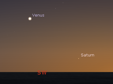 Venus and Saturn low on the southwest tonight at 6 p.m. December25, 2019. Saturn is only 3 1/2 degrees above the Lake Michigan horizon. Created using Stellarium.