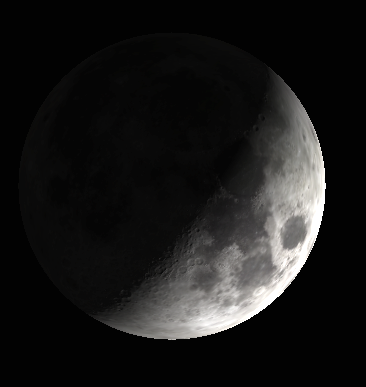 The crescent Moon as it might appear in binoculars or a small telescope tonight at 7 p.m. January 1, 2020. Created using Stellarium.