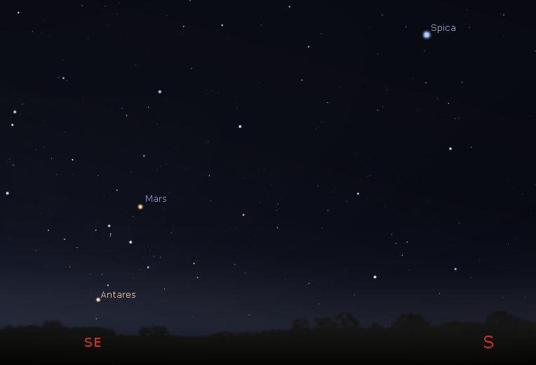 Mars in the morning with the bright stars at 7 a.m. January 1, 2020. Note that Mars is approaching the red giant star Antares. The name Antares means “Rival of Mars” (Ant – anti, Ares -the Greek god of war that the Romans appropriated as Mars). Mars will pass 4.8 degrees north of Antares on the 17th. Click on the image to enlarge. Created using Stellarium.