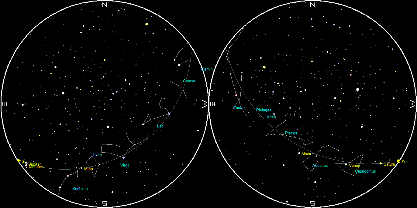 Let’s look at the naked-eye planets for this week. Venus is our evening star low in the southwest in the early evening. It will set at 8:02 p.m. Saturn sets only 50 minutes after sunset and is not visible. It will pass behind the Sun on the 13th and will then join Jupiter in the morning sky. Jupiter is too close to the Sun in the morning twilight to be seen. Mars is visible in the morning sky and will rise in the east-southeast at 5:04 a.m. It’s not very bright because it’s 202 million (326 million km) miles away, but it’s getting slowly closer to the Earth at the rate of about 4 million miles (6 million km) a week. Mercury is now too close to the Sun to be seen in the morning, but will move into the evening sky on the 10th.