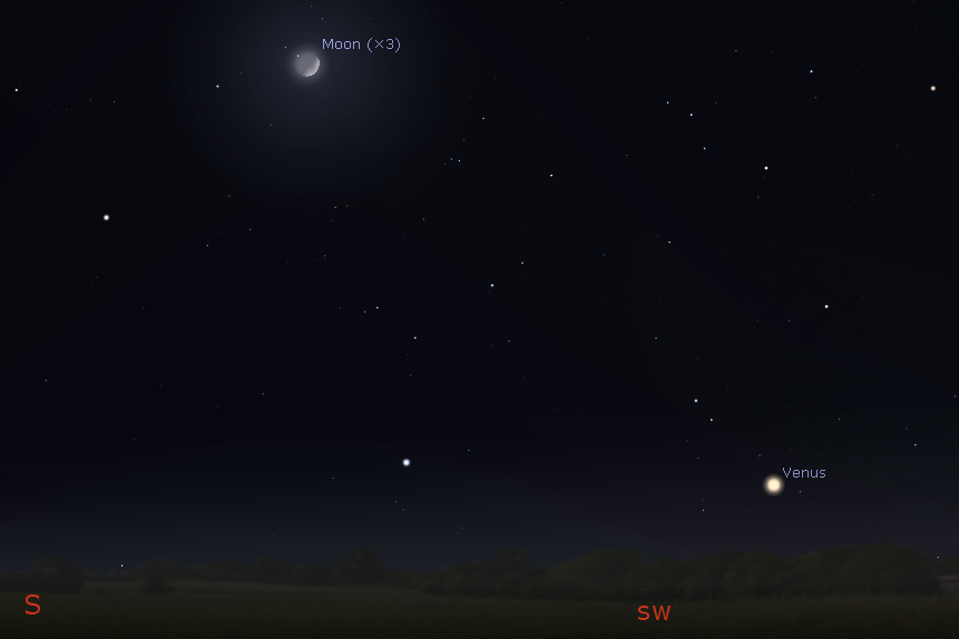 Venus and the Moon in the evening tonight at 7 p.m. January 1, 2020. Click on the image to enlarge. Created using Stellarium.