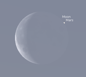 Sorry, I missed this until now. Tomorrow morning the 18th Mars will be occulted by the Moon. For Northern Lower Michigan Mars will disappear shortly after 7:10 a.m. The exact time depends on your location, so I can’t be more specific. At that time the Moon and Mars will be in the southeastern sky. Mars is now first magnitude, but will fare poorly in the morning twilight, so I’d suggest finding the Moon and Mars at least 15 minutes earlier with binoculars or telescope. Mars will reappear at the Moon’s unlit side around 8:37 a.m. This is after sunrise, so a telescope will be required to spot it. Hoping for clear skies, though the weather forecast isn’t promising.