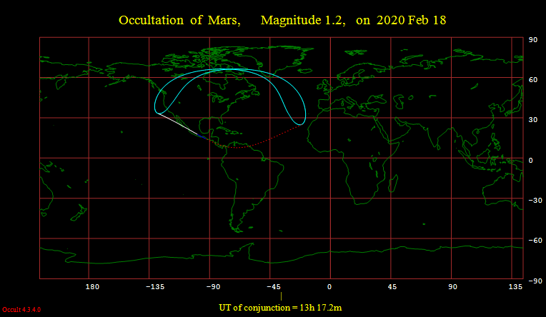 02/17/2020 – Ephemeris Extra – The Moon will cover the planet Mars in morning twilight tomorrow, Tuesday the 18th.