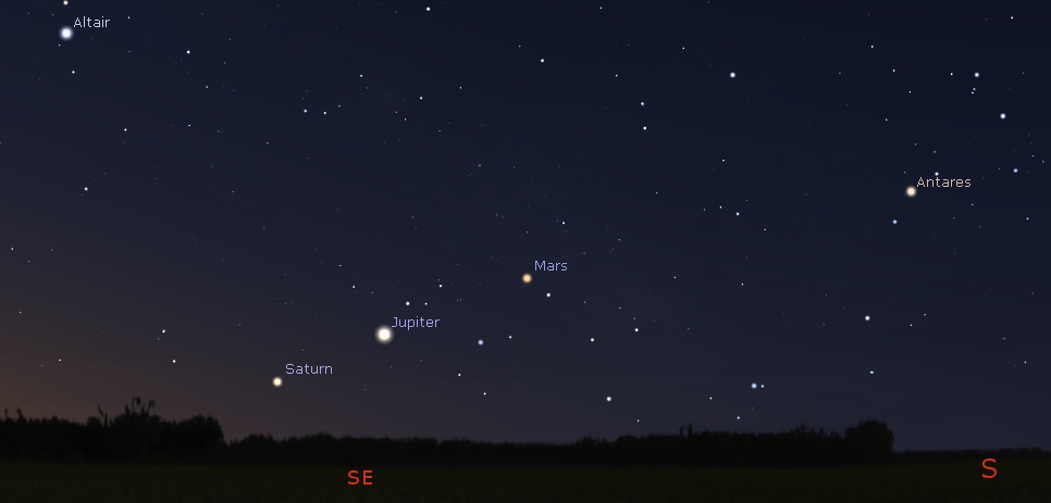 The morning planets and stars visible in the southern sky at 6:30 a.m. tomorrow morning February 37, 2020. The star Antares is in the constellation of Scorpius. Mars sits on top of the lid of the Teapot asterism of the constellation of Sagittarius the archer. Jupiter and Saturn are seen to the lower left. Click on the image to enlarge. Created using Stellarium.