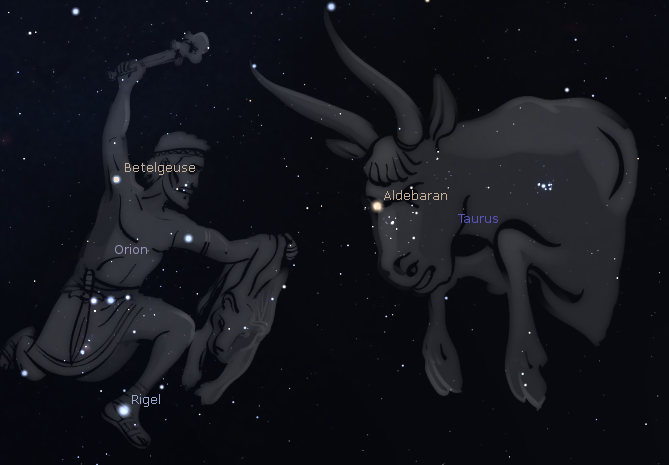 The classical constellation figures of Orion the hunter and Taurus the bull appear to be interacting in the sky. Orion is in the south at 9 p.m. An angry Taurus, a bit above him in the southwest, appears to be charging at Orion who appears to be facing him with lion skin shield and an upraised club. Orion’s two hunting dogs, canes major and minor, appear to be unconcerned. The face of Taurus the bull is a letter V shape of faint stars with a bright reddish star at the upper left tip of the V called Aldebaran the bull’s angry bloodshot eye. There’s no mythological story that goes with this. Both Orion and Taurus have their own myths associated with them separate from their apparent clash in the heavens.