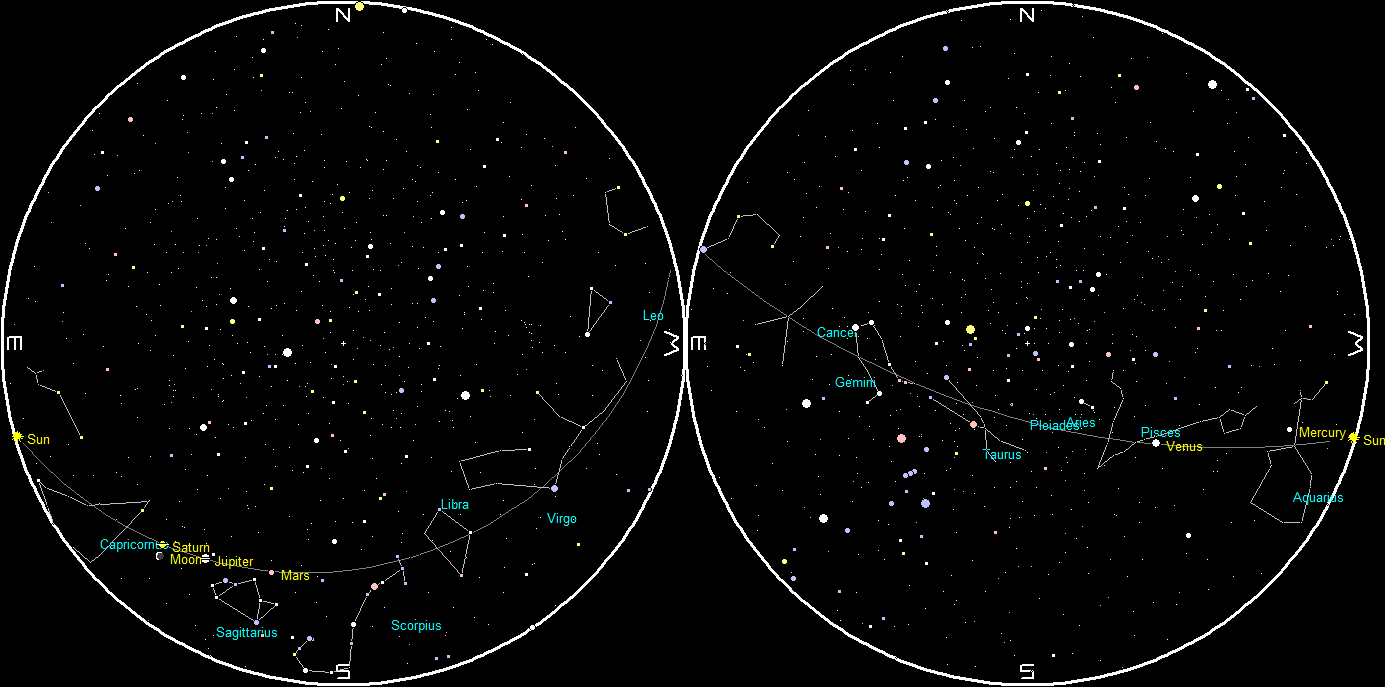 The planets and stars are plotted for the 15th at 10 p.m. EDT in the evening and 6 a.m. for the morning chart. These are the chart times. The brilliant planet Venus is our Evening Star in the West at chart time. Note that Traverse City is located approximately 45 minutes behind our time meridian, West 75° longitude. (An hour 45 minutes behind our daylight saving time meridian during EDT).