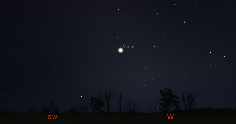 Venus and the Moon in the western sky at 7:30 p.m. or about an hour after sunset. February 26, 2020. Created using Stellarium.