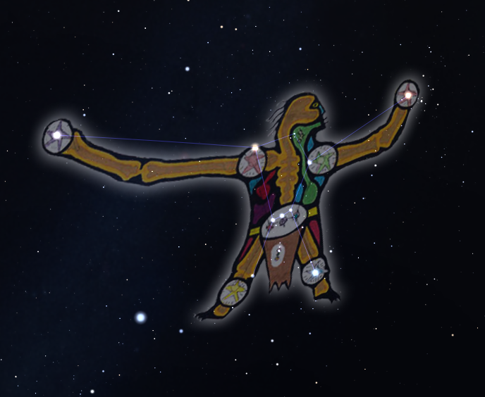 We observe the constellation of Orion in the south at 9 p.m. and think of the hapless Greek hero. To the Hebrews it was Kesil, the fool who built the tower of Babel hoping to reach heaven. To the Anishinaabe native peoples of this place it is the Wintermaker whose rising in the evening announces the coming of winter. Where Orion’s arms carry a lion skin shield and a club, the Wintermaker’s arms are exaggerated and extend from Aldebaran in Taurus to Procyon in Canis Minor, embracing just about all of the winter sky. Two other Anishinaabe constellations are entering the skies at this time in the east and northeast, to announce the coming of spring. One the pleasures and the other the dangers.