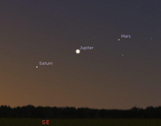 Let’s look at the naked-eye planets for this week. Venus is our evening star shining brightly in the west for most of the evening. It will set at 10:34 p.m. The rest of the planet action is in the morning. Mars will rise in the southeast at 4:19 a.m. It’s getting as bright as a first magnitude star because it’s 157 million (253 million km) miles away, and it’s getting slowly closer to the Earth at the rate of about 6 million miles (9 million km) a week. However it’s brighter than Betelgeuse. Jupiter will rise at 4:46 a.m. Lastly, Saturn will rise at 5:14 tomorrow morning. Mars is catching up to Jupiter and Saturn. It will pass south of Jupiter on the 20th, and Saturn on the 31st. It might be worth getting up for before 6 a.m. to spot.