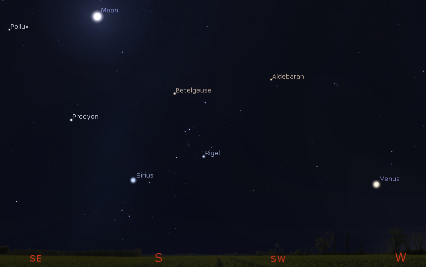 Venus, the bright winter stars and the Moon tonight, 8 p.m. March 4, 2020. Click on the image to enlarge. Created using Stellarium.