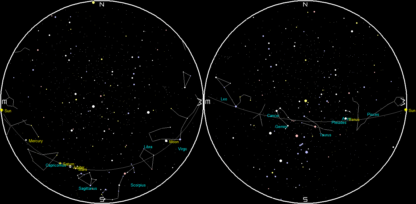 Planets and the Moon at sunset and sunrise of a single night starting with sunset on the right on March 11, 2020. The night ends on the left with sunrise on the 12th. Click on the image to enlarge. Created using my LookingUp program.