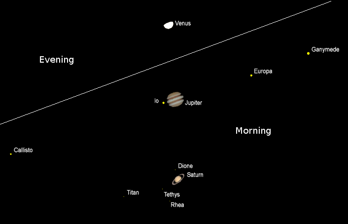 The planets as seen in a telescope with the same magnification. Venus in the evening and Jupiter and Saturn in the morning on the night of March 11/12, 2020. Apparent diameters: Venus, 20.7″; Jupiter, 35.1″; Saturn, 15.7″, rings, 36.6″. Mars at 5.8″ won’t be added until it reaches 10″. The ” symbol means seconds of arc (1/3600th of a degree.) Created using Cartes du Ciel (Sky Charts).