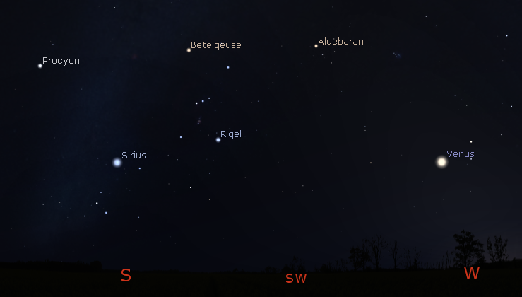 Venus and evening bright stars tonight at 9 p.m., March 11, 2020. Click on the image to enlarge. Created using Stellarium.