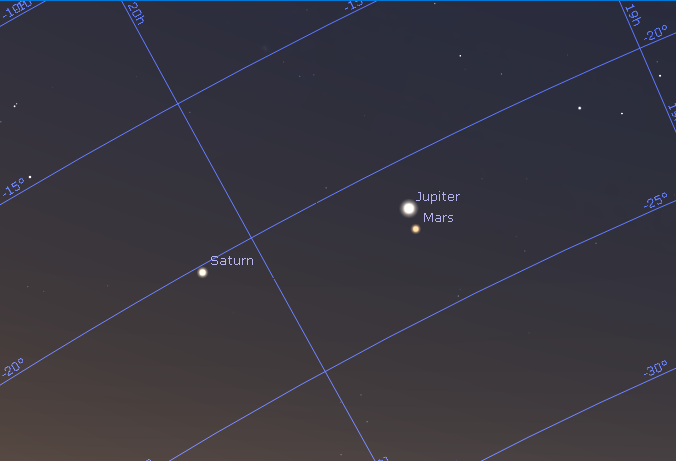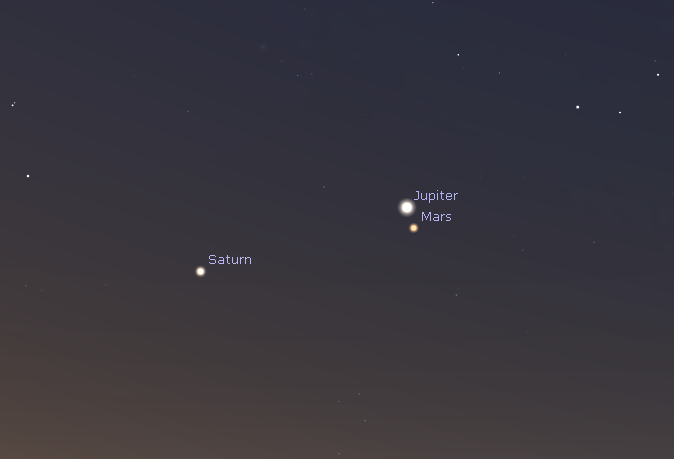 The three morning planets in the southeast at 7 a.m. Friday March 20, 2020. Appearing in the southeast means that Mars being south of Jupiter does not mean that it is not directly below Jupiter. See the chart below. Created using Stellarium.