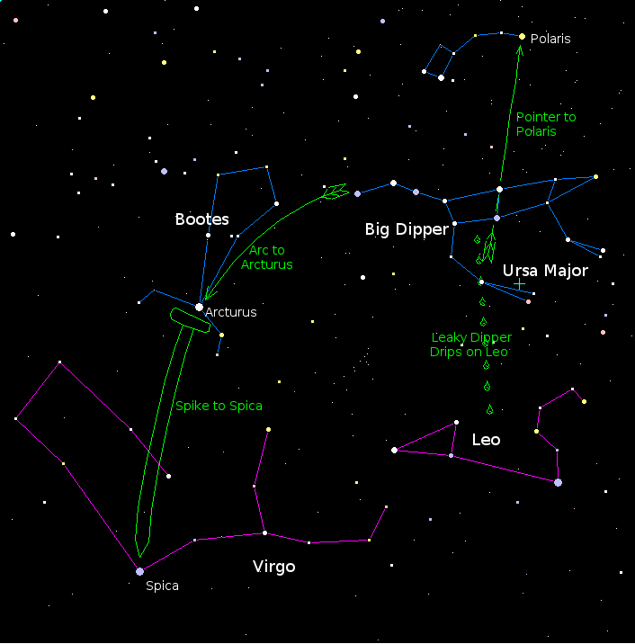 The Big Dipper can be used to point to other stars and constellations. Right now the Big Dipper is nearly overhead. The front bowl stars point to Polaris, the North Star which never seems to move in the sky. The handle can be used to find two stars. First follow the arc of the handle away from the bowl to find the fourth brightest night-time star Arcturus in the base of the kite shaped constellation of Boötes. Straighten the arc to a spike and continue to the south and you will come to the bright blue-white star Spica in Virgo the virgin. You can remember these stars with the phrase “Follow the arc of the handle to Arcturus and then spike to Spica” or if you prefer the alternate pronunciation of the latter star “Speak to Speeka”.