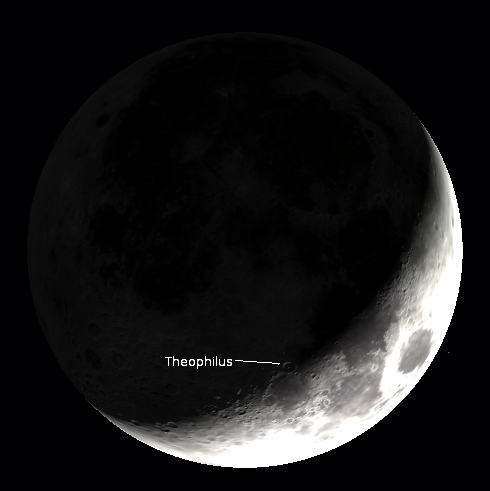 If my Moon charting software is correct this is the one evening out of the month when the central peak of the crater Theophilus catches the first rays of the rising Sun, while the crater floor is in shadow. It kind of looks like a bulls eye. It can be spotted with binoculars on the inside of the crescent, on the terminator, the sunrise line about half way between the ends of the crescent. Theophilus is 61 miles (101 km) in diameter. A telescope of any size with 30 to 50 power magnification will really bring out the detail. More magnification may be warranted, but if the bigger image becomes fuzzy, back off the power. It may be the diameter of your telescope due to the wave nature of light or the atmosphere you’re looking through that’s causing the problem.