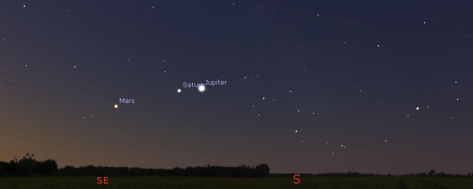 The planets as seen in a telescope with the same magnification. Venus in the evening and Jupiter and Saturn in the morning on the night of April 29/30, 2020. Apparent diameters: Venus, 40.58″; Jupiter, 40.62″; Saturn, 16.92″, rings, 39.42″. Mars at 7.59″ won’t be added until it reaches 10″. The ” symbol means seconds of arc (1/3600th of a degree.) Created using Cartes du Ciel (Sky Charts).