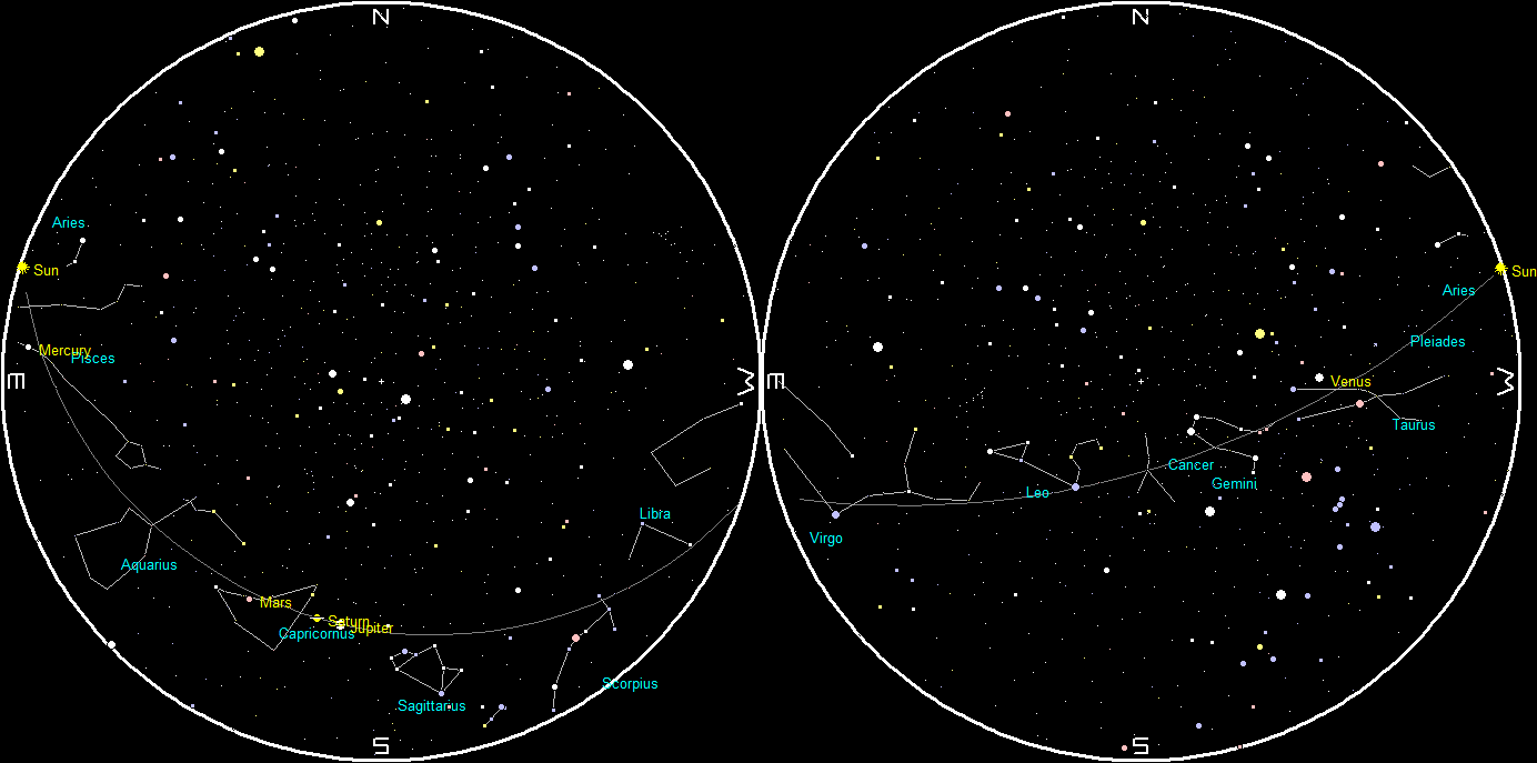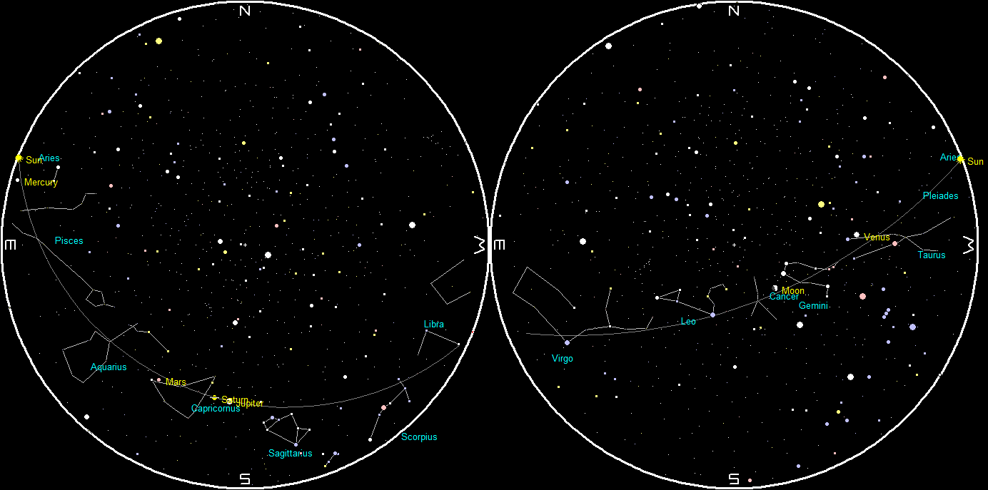 Planets and the Moon at sunset and sunrise of a single night starting with sunset on the right on April 29, 2020. The night ends on the left with sunrise on the 30th. The closeness of Jupiter and Saturn in the morning sky unfortunately overlays planets and labels. Click on the image to enlarge. Created using my LookingUp program.