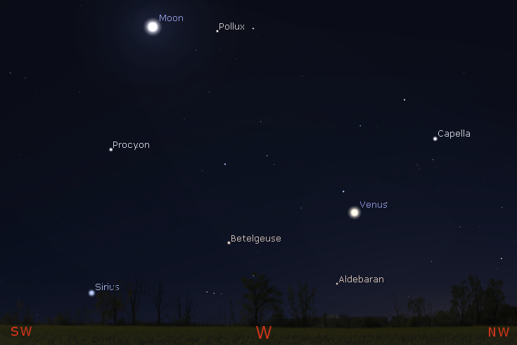 Venus and the fat crescent Moon tonight at 10 p.m. April 29, 2020. Click on the image to enlarge. Created using Stellarium.