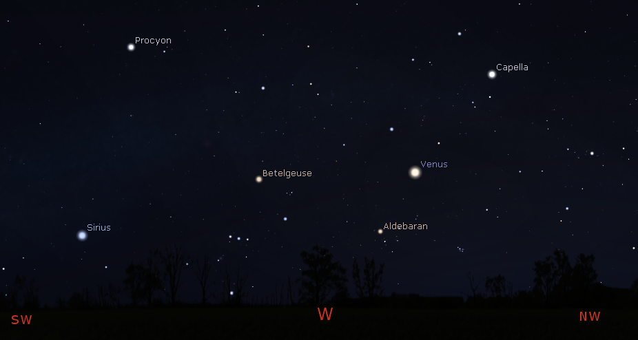 Venus in the west-northwest at 10 p.m. tonight, April 22, 2020. Click on the image to enlarge. Created using Stellarium.
