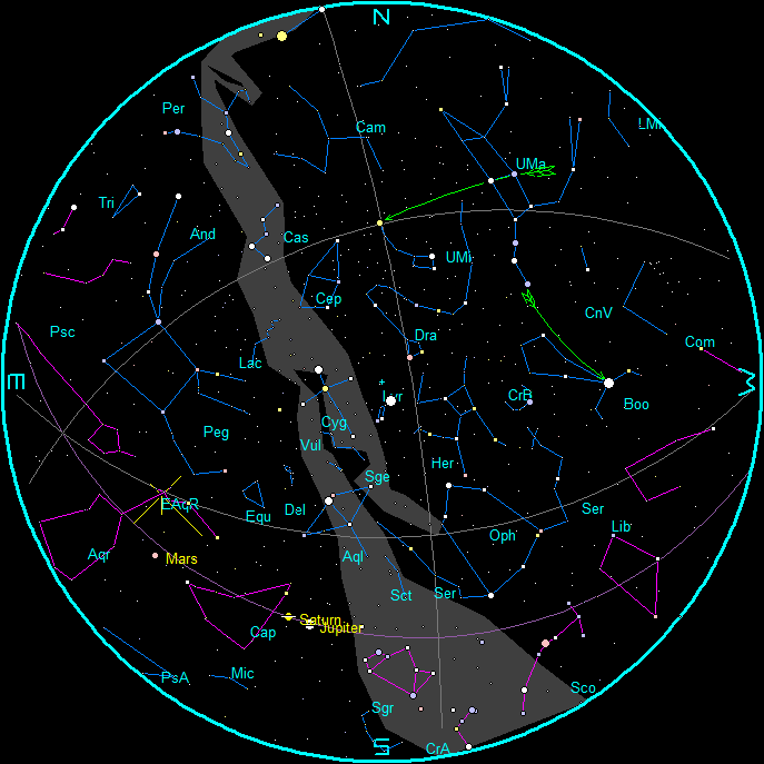 The planets and stars are plotted for the 15th at 11 p.m. EDT in the evening and 5 a.m. for the morning chart. These are the chart times. Note that Traverse City is located approximately 45 minutes behind our time meridian, West 75° longitude. (An hour 45 minutes behind our daylight saving time meridian during EDT). To duplicate the star positions on a planisphere you may have to set it to 1 hour 45 minutes earlier than the current time.