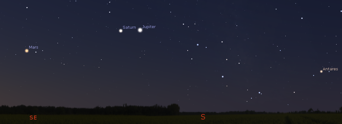 Morning planets in twilight at 5:30 a.m. tomorrow morning, May 7, 2020. Click on the image to enlarge. Created using Stellarium.