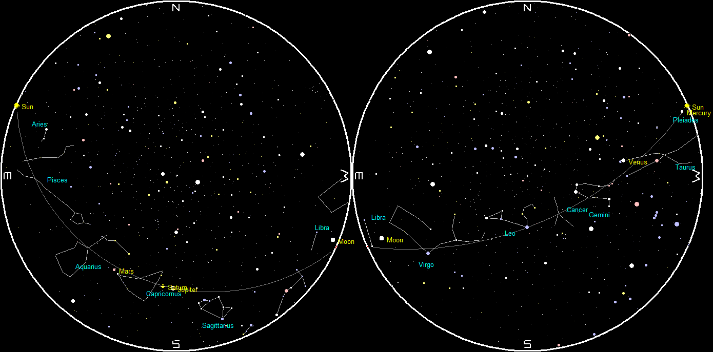 Planets and the Moon at sunset and sunrise of a single night starting with sunset on the right on May 6, 2020. The night ends on the left with sunrise on the 7th. The closeness of Jupiter and Saturn in the morning sky unfortunately overlays planets and labels. Click on the image to enlarge. Created using my LookingUp program.