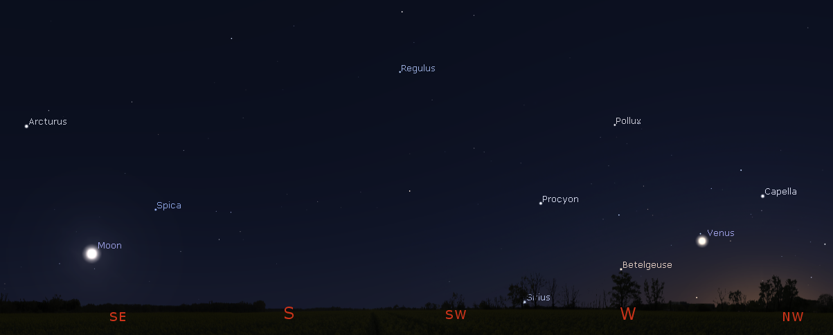 Venus, the Moon and bright evening stars tonight at 10 p.m. May 6, 2020. Click on the image to enlarge. Created using Stellarium.