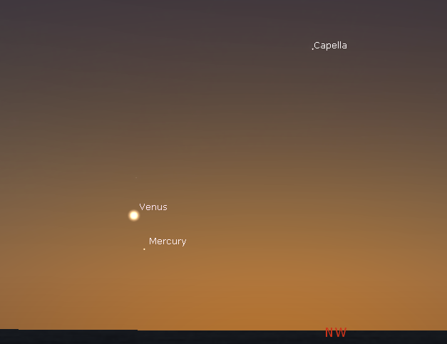 Venus and Mercury as it should appear at 10 pm low in the northwest over the Lake Michigan horizon. May 20, 2020. Created using Stellarium.