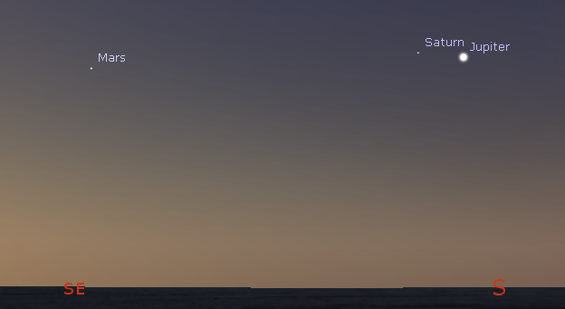 Jupiter, Saturn and Mars seen in the southern sky at 5:30 am tomorrow morning May 21, 2020. Created using Stellarium.