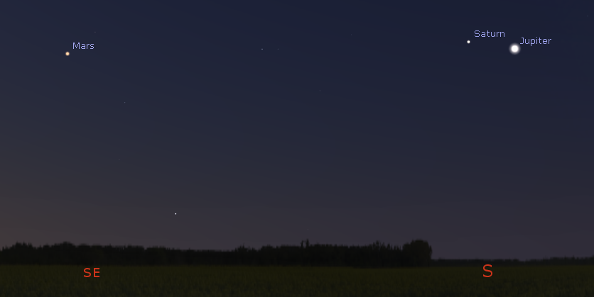 Jupiter, Saturn and Mars in the growing twilit skies of 5 am tomorrow morning, June 4, 2020. Click on image to enlarge. Created using Stellarium.