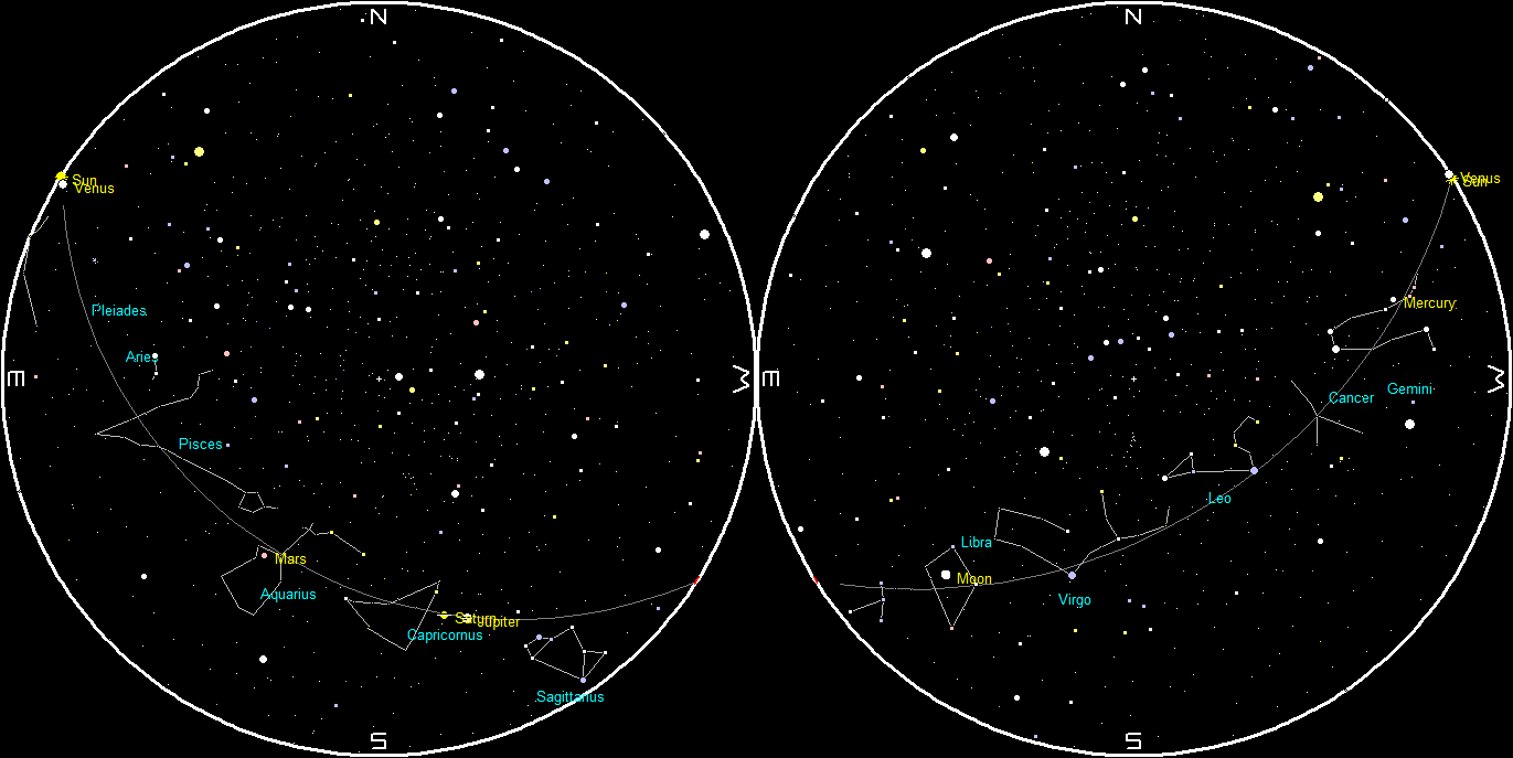 Planets and the Moon at sunset and sunrise of a single night starting with sunset on the right on June 3, 2020. The night ends on the left with sunrise on the 4th. The closeness of Jupiter and Saturn in the morning sky unfortunately overlays planets and labels. Click on the image to enlarge. Created using my LookingUp program.