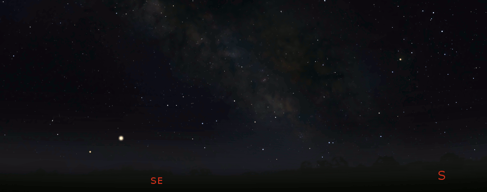 Jupiter and Saturn finder animation for midnight June 18, 2020. For other locations, approximately 2 1/2 hours after sunset. Also showing the stars of the Teapot of Sagittarius to the upper right of the SE compass point and most, except the bottom stars of Scorpius in the south. Click on the image to enlarge. Created using Stellarium and GIMP.