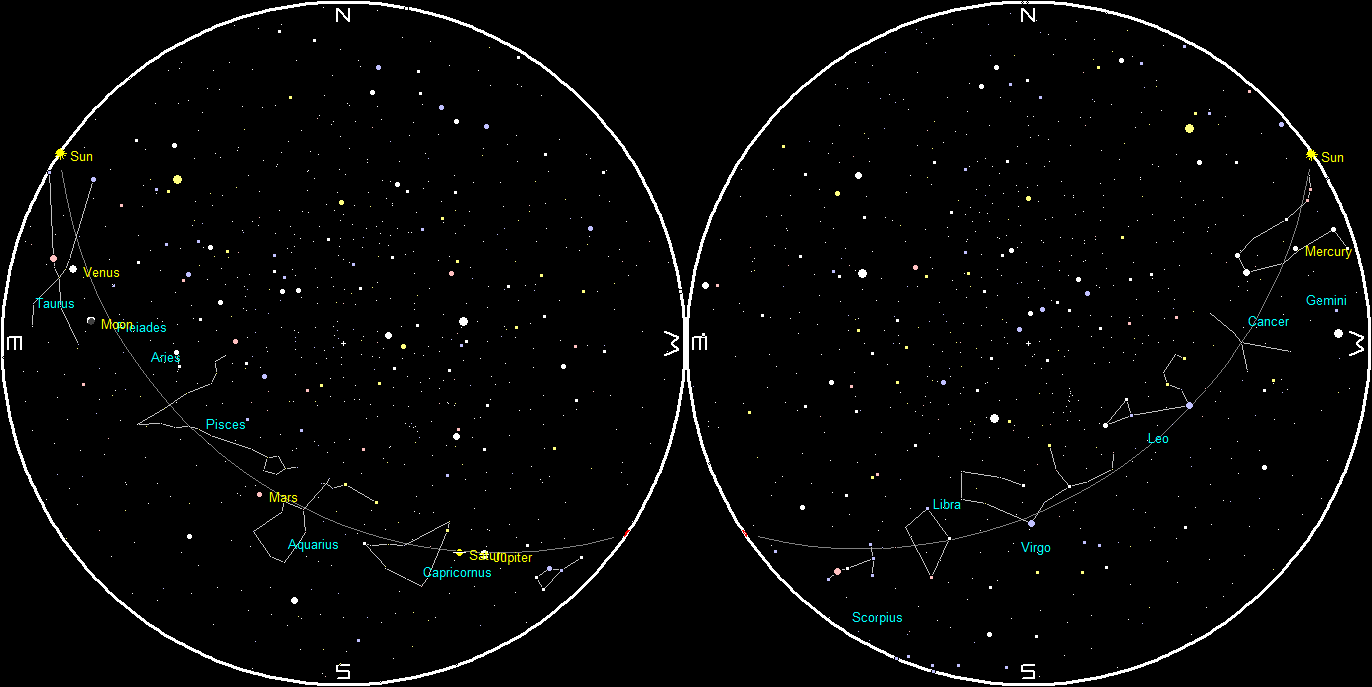 Planets and the Moon at sunset and sunrise of a single night starting with sunset on the right on June 17, 2020. The night ends on the left with sunrise on the 18th. The closeness of Jupiter and Saturn in the morning sky unfortunately overlays planets and labels. Click on the image to enlarge. Created using my LookingUp program.