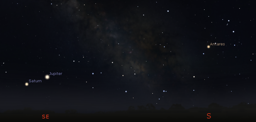 Jupiter & Saturn at midnight. Note the Teapot of Sagittarius to the right of Jupiter and the stars of Scorpius including Antares farther right. Click on the image to enlarge. Created using Stellarium.