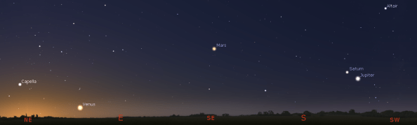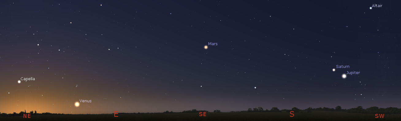 Four of the five naked-eye planets stretched out on this panorama from northeast to southwest at 5 am tomorrow morning June 25, 2020. Click on the image to enlarge. Created using Stellarium.