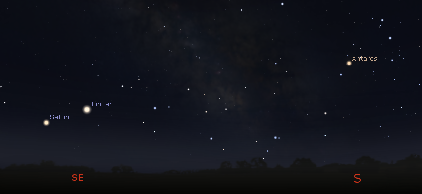 Saturn and Jupiter planets plus two southern constellations to the right of them at 11 pm tonight July 8, 2020. Just right of Jupiter is Sagittarius that looks more like a teapot than a centaur with a bow and arrow. Further right is Scorpius the scorpion. Click on the image to enlarge. Created using Stellarium.