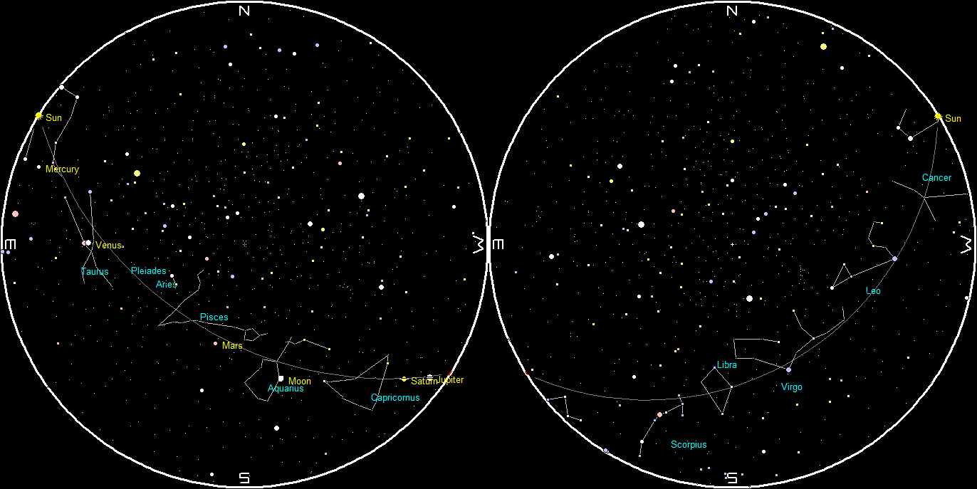 Planets and the Moon at sunset and sunrise of a single night starting with sunset on the right on July 8, 2020. The night ends on the left with sunrise on the 9th. The closeness of Jupiter and Saturn in the morning sky unfortunately overlays planets and labels. Click on the image to enlarge. Created using my LookingUp program.