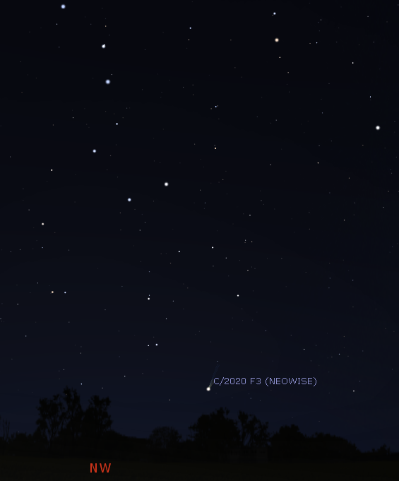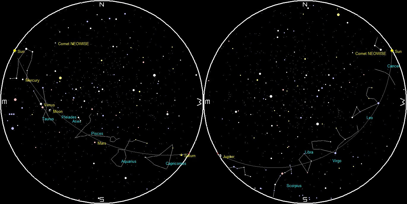 Let’s look at a comet and naked-eye planets for this week. Jupiter now rises before sunset and now is an official evening planet. It’s seen low in the southeast in the evening. To the left of it will be Saturn. The next planet up will be Mars which will rise at 12:41 am. Its now down to 67.8 million miles (109.2 million km) away, as the Earth slowly overtakes it at the rate of about 3.7 million miles (6 million km) a week. Venus will rise at 3:33 am in the east-northeast as our Morning Star. Newly discovered Comet NEOWISE is now visible in the evening sky A good time to start looking would be about 10:45 pm toward the northwest. The comet is trending brighter than early predictions and sports a wide tail. The comet gets its name from the NASA Satellite and mission to detect near Earth objects or NEOs in the infrared.