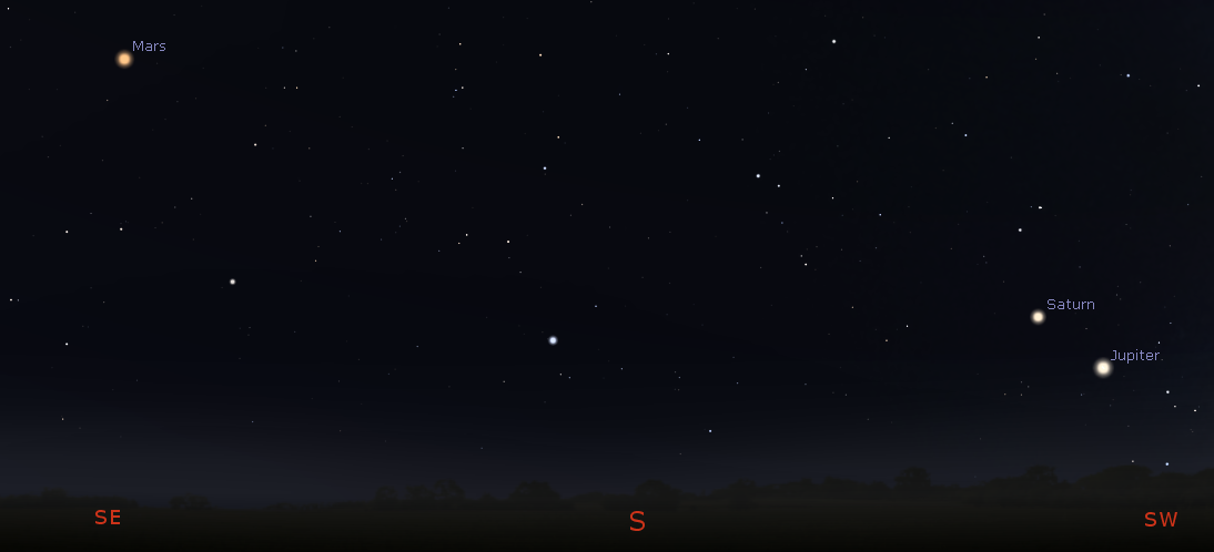 Mars, Saturn and Jupiter at 4:30 tomorrow morning July 16, 2020. Click on the image to enlarge. Created using Stellarium.