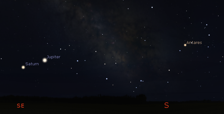 Saturn and Jupiter in the evening tonight at 11 pm July 15, 2020. Also shown are the stars of the Teapot of Sagittarius and Scorpius to the right. Click on the image to enlarge. Created using Stellarium.