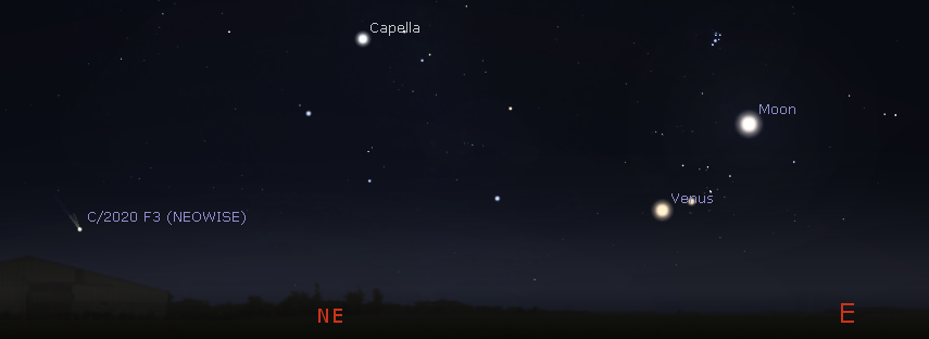 Venus, the Moon and the comet in the morning at 4:30 am or about an hour, 45 minutes before sunrise. Click on the image to enlarge. Created using Stellarium.