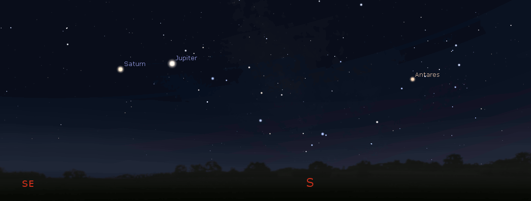 Jupiter and Saturn animation at 10 pm with Sagittarius and Scorpius constellation lines. Click on the image to enlarge. Created using Stellarium and GIMP.