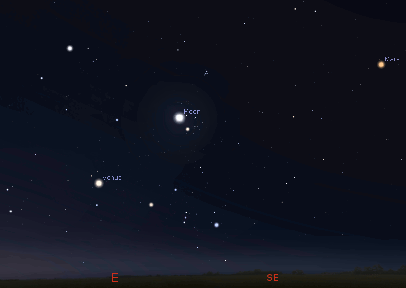 The Moon as it might be seen in binoculars at 5:30 am tomorrow August 13, 2020. Created using Stellarium.