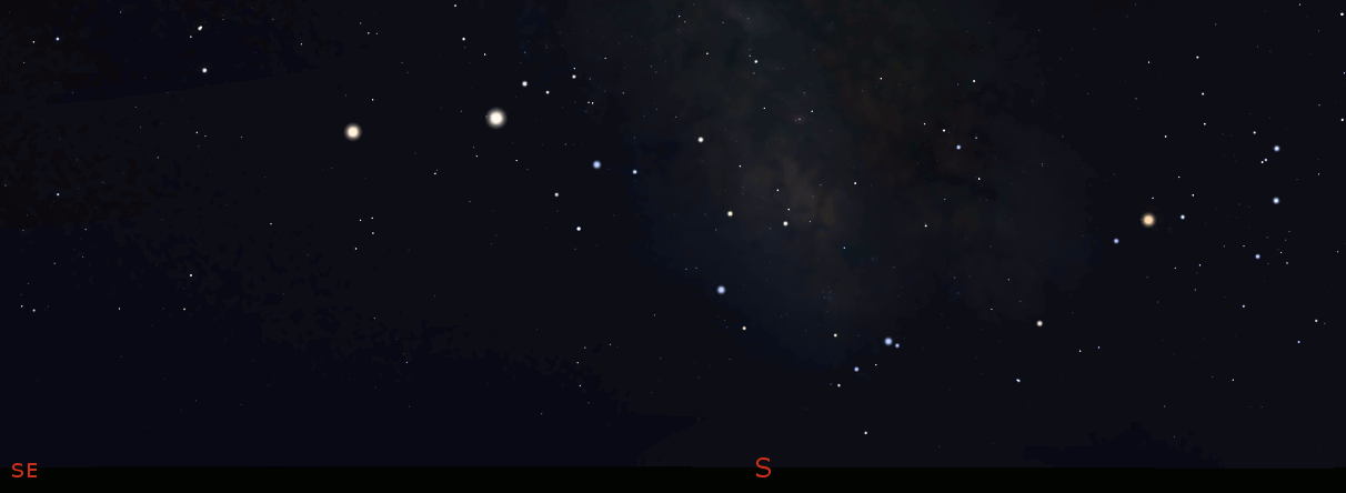 Jupiter and Saturn with three constellations of the zodiac at 10 pm tonight August 19, 2020. Click on the image to enlarge. Created using Stellarium and GIMP.