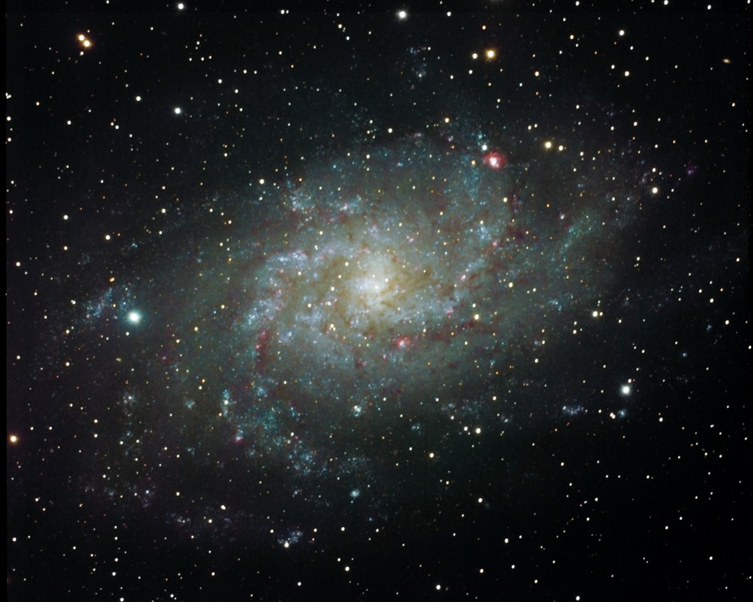 M33, the Triangulum Galaxy is the third largest galaxy in the Local Group after Andromeda and the Milky Way. It appears in the sky just east of the constellation of Andromeda in Triangulum the triangle. Though large it has a very low surface brightness making it hard to spot with binoculars or a telescope. Credit: Scott Anttila.