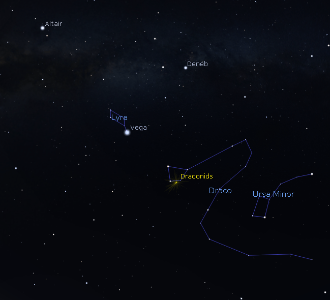 The Draconid radiant in the head of Draco. Looking high in the northwest at 9 pm October 6th. The source of the Draconids is the Comet 21P/Giacobini-Zinner. The stars of the Summer Triangle are named.