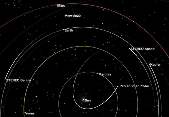 Inner solar system on October 13, 2020 showing Mars at opposition from the Sun. The Sun, Earth and Mars are in a straight line. Note the motion of the planets and space probes are counterclockwise. Mars was closest to the Earth a week ago. It is moving away from the Sun in its orbit. Its closest point to the Sun, called perihelion, at about the 2 o’clock point in its orbit. The Mars 2020 Rover “Percy” has a bit more than 4 months to go to reach Mars. Credit: NASA Eyes App https://eyes.nasa.gov/.