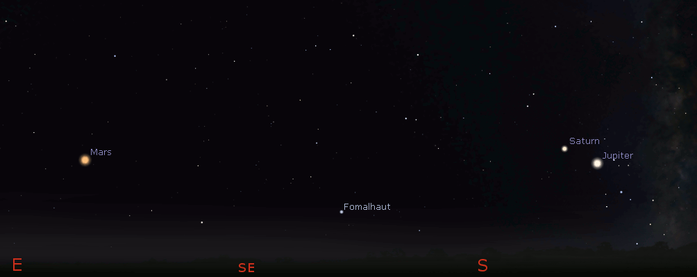 Evening Planets animation showing Jupiter, Saturn and Mars with the constellations of the zodiac for 9 pm October 14, 2020. Click on the image to enlarge. Created using Stellarium.