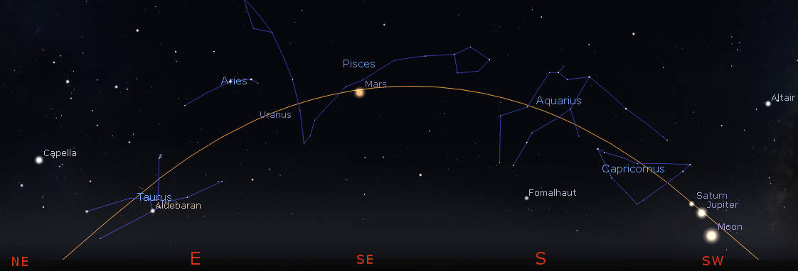 Evening planets, Moon, ecliptic and zodiac at 7:30 pm tonight November 18, 2020. Click on the image to enlarge. Created using Stellarium.